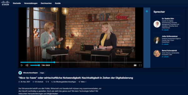 Die Premiere der 5. Folge von CISCO Deutschland Digital: Nachhaltigkeit in Zeiten der Digitalisierung war am 30.11.2021. Ich war dort als Expertin zu Corporate Digital Responsibility zu Gast. Wer sie verpasst hat, gelangt im Beitrag zur Aufzeichnung.